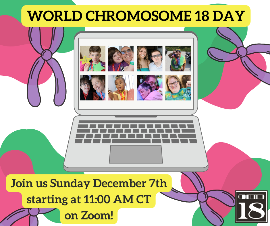 Join us for World Chromosome 18 Day 2025 on Zoom! This no cost, day-long broadcast is Chromosome 18’s “mini-Conference” that we are inviting you to join from the comfort of your own home. The broadcast will feature research updates from Dr. Cody and the Clinical Research Center team, syndrome support sessions, topic discussions and Q&As with the medical professionals and the world’s leading experts on chromosome 18 conditions, a sibling breakout, self-advocate activity, and of course, a holiday dance party to bring our broadcast to a close. Tentative Schedule will be available soon. Zoom registration is required to join the broadcast, just use the link below. We can’t wait to see you there!