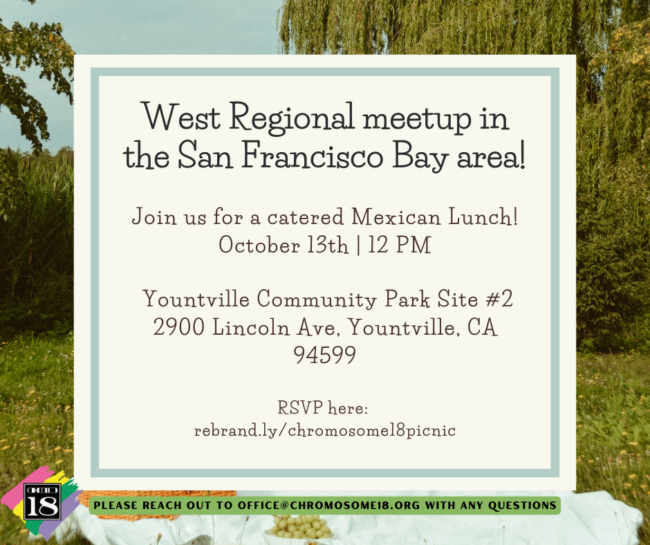 Join us for the 2nd Annual Chromosome 18 Family picnic! Join in again on October 13th starting at 12pm to connect with other C18 families at the Yountville Community Park in Yountville, CA. Please RSVP below and we hope to see you there!