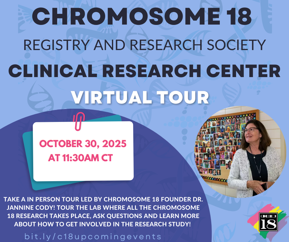 Chromosome 18 will be hosting our virtual Clinical Research Center Tour over Facebook live and then a Q&A on zoom. This tour is led by founder of Chromosome 18, Dr. Jannine Cody. Dr. Cody will be showing the lab where all the Chromosome 18 research takes place and then you will have a chance to ask your questions directly to Dr. Cody after she shows you around the lab. This is a wonderful opportunity to talk to the leading researcher in Chromosome 18 research! Join us first on Facebook to watch the live tour and then switch over to zoom after the tour to ask your questions directly to Dr. Cody! Join us October 30th at 11:30am CT.