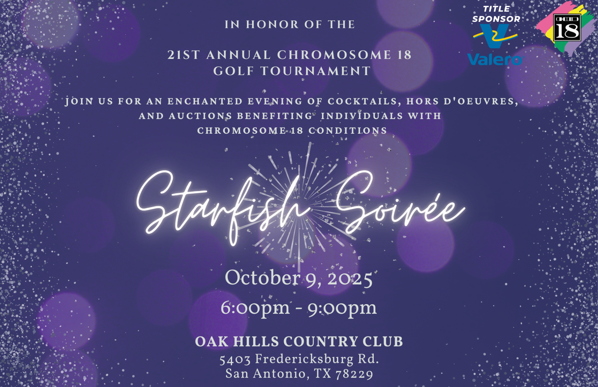 Join your fellow golfers, their loved ones, chromosome 18 families, and community members in celebration of the Annual Golf Tournament. The reception will feature specialty cocktails, hors d’oeuvres, wine pull, and silent and live auction, all while taking in the breathtaking natural beauty at Oak Hills Country Club. Included in your registration for the Tournament is admission for you and one guest to attend the Soiree. It’s an evening dedicated to celebrating our achievements, sharing inspiring stories of our special-needs children and their families, and setting the stage for the road ahead. The Soiree is a celebration of the impact that you have on those affected by chromosome 18 conditions – by playing in the Tournament, you are supporting research to make rare chromosome 18 conditions the first treatable chromosome abnormalities.