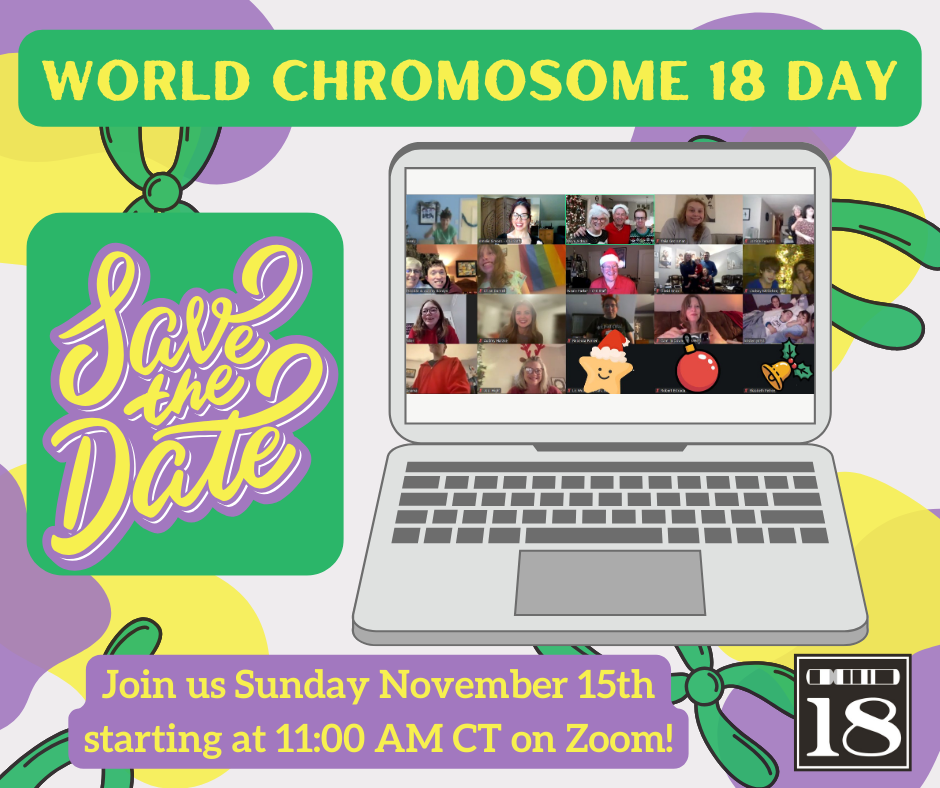 Join Chromosome 18 families from around the World that come together on Sunday November 15th, 2026 on Zoom for World Chromosome 18 Day! This FREE, virtual event is a chance to come together with our global chromosome 18 families to learn, connect, and have fun! Pre-Registration is required before you can join other families. More information about the schedule can be found on the “World C18 Day” section of our events tab. This will be the 4th Annual World C18 Day and we’re so excited to invite everyone to join this special live educational and connection event.