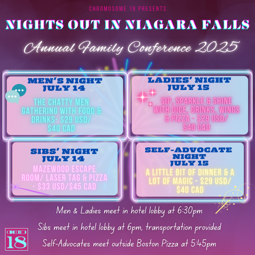 Join Chromosome 18 in Niagara Falls, ON for an incredible series of evenings out! Take in the sights and spend time relaxing and enjoying the company of other Conference attendees after the day’s sessions. Nights Out are optional activities that you can choose to participate in if you so desire.